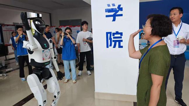 迎新现场开启“AI模式”,一位超炫酷的“新成员”,成为回头率最高的“志愿者”,该机器人可以完成握手、比心等互动动作,机器人化身“舞者”,拉满科技感;同时体验学生自主研发的VR眼镜,眼前“凤凰展翅欢迎2025级新生”的画面,现场纷纷互动体验,尽显学院专业特色与优势。