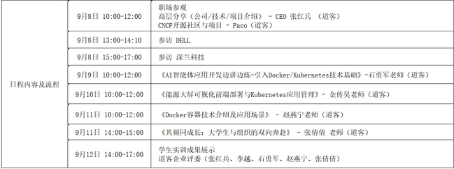 经计算机学院与道客网络科技公司的多轮协商与精心设计,确定了本次夏令营的主旋律为“企业参访—企业导师线下讲解+任务驱动学生自主探索—学生汇报展示”。学生参访了云原生领域的创新领导者上海道客(DaoCloud)网络科技有限公司、世界500强企业戴尔(DELL)股份有限公司、人工智能领域领军企业深兰人工智能科技(海)股份有限公司,学习了云原生的核心技术Docker/Kubernets,并以小组形式完成了“能源大屏可视化前端部署”、“AI智能体应用开发”项目的设计、开发与部署。道客公司首席执行官张红兵、技术总监李越、技术专家石勇军、技术专家赵燕宁、技术专家张倩倩参与授课,并参加学生汇报答辩评审。同学们答辩表现优秀,现场收到企业的实习邀请。