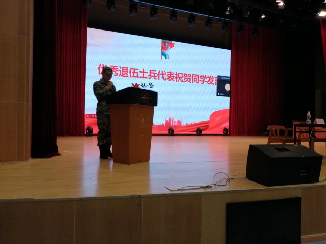 其次,优秀退伍士兵代表祝贺同学通过分享自己的军旅生涯,以及从军两年的收获,让同学们更加直观的认识军营生活,进一步激发同学们参军入伍的梦想。