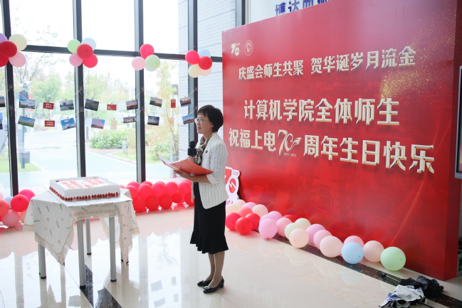 七秩盛典如约,共享祝福蛋糕。在校庆嘉年华特别活动伊始,计算机学院师生共聚,祝福上电70周年生日快乐。学院党委书记魏建华代表全院师生祝福上电,并代表学院向全体师生员工、离退休老同志、海内外校友和长期关心支持学院学校事业发展的各界人士致以崇高的敬意和美好的祝愿;她讲到七十年栉风沐雨,薪火相传,一代代上电人用勤劳和智慧谱写了学校发展的辉煌篇章,计算机学院随着学校的发展不断壮大,学院师生顽强拼搏、屡创佳绩,在科研科创、招生就业、校企共建等方面取得突破性成就;真诚地希望各界人士和校友一如既往支持学院学校发展,希望各位老师用知识、学问、思想、智慧培育学生践行育人使命,希望同学们勤奋学习、勇于创新成为胸怀远大理想的栋梁之才;展望未来,学院定会不忘初心担使命、砥砺奋进再出发,为推动学院学校改革发展作出新的更大贡献,为中华民族伟大复兴做出应有的贡献。