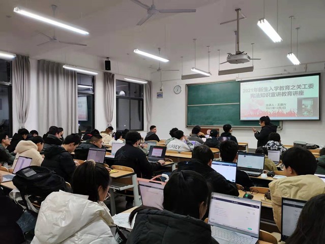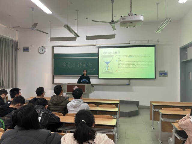 “学宪法,讲宪法”,学院将学讲宪法活动与党史教育相结合,通过班干部宣讲、学生交流、知识竞答以及学生宣誓等形式,开展以宪法为核心的法治宣传教育主题班会。2021年11月22日至今,学院共组织开展主题班会近30场,涵盖全院本科生800余人。在主题班会中,班级以爱国主义教育为重点,紧密结合历史文化,进一步普及宪法知识,并针对近期学生遭遇的诈骗案件,在法治宣传教育中增加了防诈骗普法宣传,意在提高学生的辨别能力。