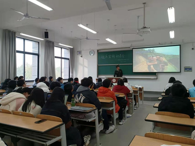 以部队的工作和生活为素材制成征兵宣传片,为同学们展示了一幅幅激昂青春的画面,同志们刻苦训练的场景、英勇正义的精气神,战友间真挚的情谊等画面带给同学们强烈的震撼与感动。他们退伍不褪色,身穿军装,英姿飒爽,身处三尺讲台讲述着自己在奋斗中“最美”的故事,进一步宣传了军人形象和钢铁军魂,极大激励了广大同学坚定报国之志,到绿色军营中逐梦青春梦想的决心。