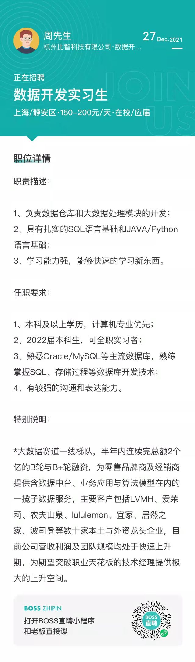 【招聘信息】259-202112杭州比智科技有限公司招聘数据开发实习生