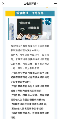 推送考场规则,营造考试氛围。学院发挥微信平台作用,推送主题教育“诚信考试,从我做起”,通过对考场规则和考试违规处理的介绍,加深学生对考试违纪作弊危害的认识,教育学生诚信为本,坚持自立自律、刻苦学习的作风,进而营造诚信笃学的良好考风。