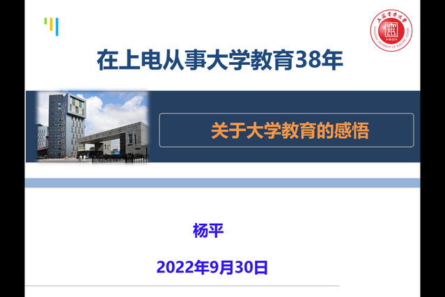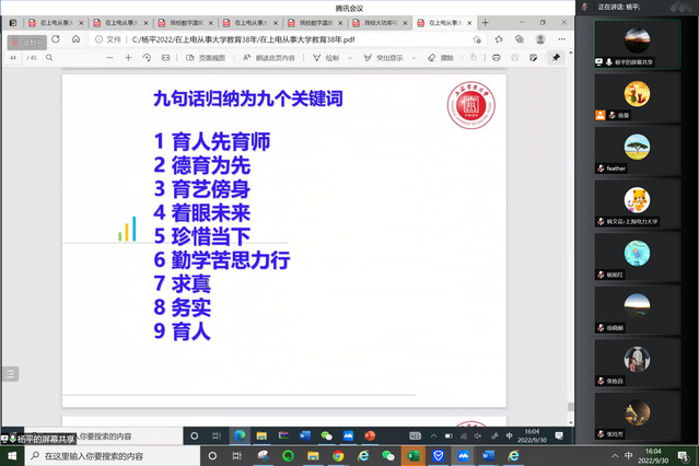 杨平老师作主题报告,他回顾了从事大学教育38年的经历,分享了他提炼的关于大学教育的九点感悟。他谈到,当教师要育人先育师,教师要拥有科学家的素养、工程师的品性、教育家的精髓;德育为先,教师要引导学生以品德高尚、能力出众、乐于奉献为追求;育艺傍身,教师要重视教学规律,讲究育人方法、导好学习大戏。做学生要着眼未来,以未来发展为导向、增学问、长才干、开眼界;珍惜当下,珍惜学习资源、专心领悟教师教诲;勤学苦思力行,善于学习、用于实践、独立思考、凝练真知。办大学要求真、务实、育人,要实事求是,真学真问求真知;务实致用,精益求精敢创新;智慧育人,千锤百炼造英才。杨老师以上海电力大学发展过程中对学校做出杰出贡献的周国定老师的事迹、誉满电业的数字温度巡测仪、为高压直流输电而研制高参数可控硅及二十年磨一剑的《自动控制原理》教材等为例阐释了当教师、做学生及办大学的要点,为与会教师上了一场精彩生动的课程思政示范课。