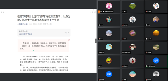 学院教务员刘志斌作为江老师曾经的学生,学习后讲到:江老师对待学生认真负责,对工作上十分敬业,他的病情反反复复,但是始终没有放下学生放下工作,忍受着病痛给学生上课、改论文,手术没几天就出差奔波,很是感人,我要学习江老师这种为教育事业献身的伟大精神,在自己的岗位上发挥光和热,做好一名好老师。工会主席于晓青表示:江老师是在用他的生命完成教书育人的使命,他用他对学生的热爱和对教学工作的激情一次次战胜病魔,战胜命运;在学生成长的关键阶段做好他们的引路人,在教学工作中他无私忘我,以身为炬;在疫情防控工作中,他挺身而出,发挥旗帜作用,是我们学习的好榜样。新进青年教师宋钰说:江老师用行动向我们青年教师彰显了“春蚕到死丝方尽,蜡炬成灰泪始干”般的无私奉献精神,倘若有一束光,就去照亮:倘若有一滴水,就去滋润,江老师对自己要求严格,教学严谨,一丝不苟;对学生、对社会竭尽全力,乐善好施,是我们学习的典范。