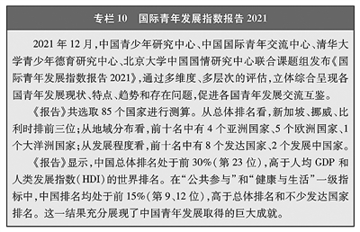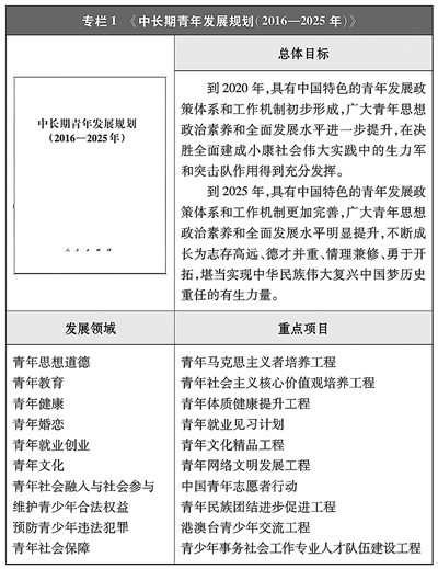 政策保障日益完备。针对中国青年多元化发展需求,国家强化政策服务导向,健全完善政策体系。国民经济和社会发展“十三五”和“十四五”规划鲜明体现青年元素,科教兴国、人才强国、创新驱动发展、乡村振兴、健康中国等国家重大战略充分关注青年群体,青年发展得到越来越多的顶层设计支持。2017年4月,中共中央、国务院制定出台新中国历史上第一个国家级青年领域专项规划——《中长期青年发展规划(2016—2025年)》,为新时代中国青年发展提供根本政策指引。针对青年在毕业求职、创新创业、社会融入、婚恋交友、老人赡养、子女教育等方面的操心事、烦心事,党和政府高度重视,各项政策举措持续出台,青年发展型城市建设蓬勃开展,青年优先发展理念日益深入人心。目前,从中央到地方的青年工作机制基本建成,具有中国特色的青年发展政策体系初步形成。青年充分享受政策红利,实实在在感受到关爱就在身边、关怀就在眼前。(见专栏1)