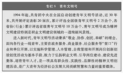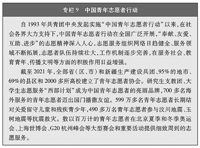 无论在城镇还是乡村、企业还是学校,青年都自觉把正确的道德认知、自觉的道德养成、积极的道德实践紧密结合起来,带头倡导向上向善社会风气、塑造社会文明新风尚。在城乡社区建设中,越来越多的青年投身社区治理和服务体系建设,主动参加“社区青春行动”,加强实践锻炼、提升服务贡献。在各行各业,青年秉承“敬业、协作、创优、奉献”的理念,踊跃创建“青年文明号”,大力弘扬新时代职业文明,展现新时代职业形象。广大青年运动员弘扬体育道德风尚,以良好的赛风赛纪和文明礼仪,获得竞技成绩和精神文明双丰收。1993年“中国青年志愿者行动”启动以来,志愿服务成为青年参与社会治理、履行社会责任的一面旗帜,成为青年在奉献人民、服务社会中锻炼成长的重要途径。截至2021年底,全国志愿服务信息系统中14岁至35岁的注册志愿者已超过9000万人,他们活跃在社区建设、大型赛事、环境保护、扶贫开发、卫生健康、应急救援、文化传承等各个领域,弘扬“奉献、友爱、互助、进步”的志愿精神,在全社会形成团结互助、平等友爱、共同前进的新风尚。中国青年志愿者扶贫接力计划研究生支教团、大学生志愿服务“西部计划”连续18年派遣41万余名研究生、大学毕业生,到中西部2100多个县(市区旗)开展扶贫支教、卫生医疗等志愿服务。青年始终是大型赛会志愿服务的主体力量,给千家万户乃至全世界留下深刻印象。(见专栏8)(见专栏9)