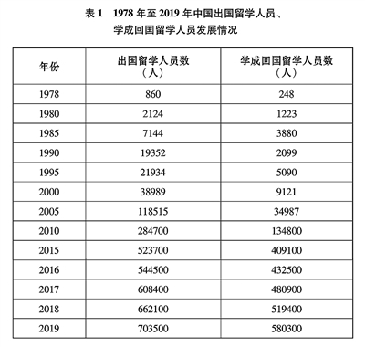 “走出去”的道路越来越宽。通过留学、务工、旅游、考察等方式,中国青年以极大的热情和包容的心态,全方位、深层次了解世界、融入世界、拥抱世界,学习借鉴其他国家的有益经验和文明成果。出国留学是中国青年了解世界的重要途径。1978年,中国选派出国留学人员仅800余名;2019年,超过70万人出国深造,40多年来各类出国留学人员累计超过650万人;1978年回国留学人员仅248人,2019年超过58万人学成回国,40多年来回国留学人员累计达420余万人。与此同时,大批中国青年通过旅游、考察、商务、劳务等方式走出国门、感知世界,2019年国内居民出境达1.7亿人次,中国青年认识世界的渠道更加广阔、国际视野不断拓展。(见表1)