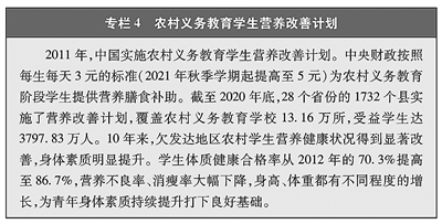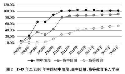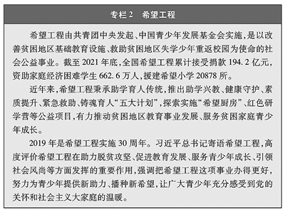 教育机会更加均等。中国教育事业优先发展不断深化,中国青年享有更加平等、更高质量的教育机会。2021年,中国义务教育巩固率达95.4%;高中阶段毛入学率达91.4%;高等教育毛入学率达57.8%、在学总规模达4430万人,居世界第一,越来越多的青年打开了通往成功成才大门的重要路径。覆盖学前教育至研究生教育的学生资助政策体系建成且日趋完善,2020年资助资金总额超过2400亿元、资助学生近1.5亿人次,实现“三个全覆盖”②。义务教育阶段进城务工人员随迁子女、农村和贫困地区学生等群体受教育权益得到充分保障。2020年,85.8%的进城务工人员随迁子女在公办学校就读或享受政府购买学位服务;2012年至2021年,农村和贫困地区重点高校专项招生计划定向招生超过82万人,让更多的青年公平享有接受更好教育的机会,阻断贫困的代际传递。
