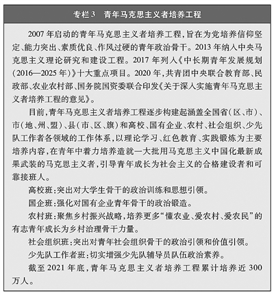 坚信中国道路。中国青年通过历史对比、国际比较、社会观察、亲身实践,深刻领悟党的领导、领袖领航、制度优势、人民力量的关键作用。2020年有关调查显示,绝大多数青年对中国特色社会主义道路由衷认同,对实现中华民族伟大复兴充满信心。用习近平新时代中国特色社会主义思想武装起来的中国青年,在展现国家发展成就的一系列生动事例、客观数字、亲身体验中,深切感受到“中国速度”、“中国奇迹”、“中国之治”,做中国人的志气、骨气、底气进一步增强,为实现中华民族伟大复兴中国梦团结奋斗的思想基础更加牢固。(见专栏3)