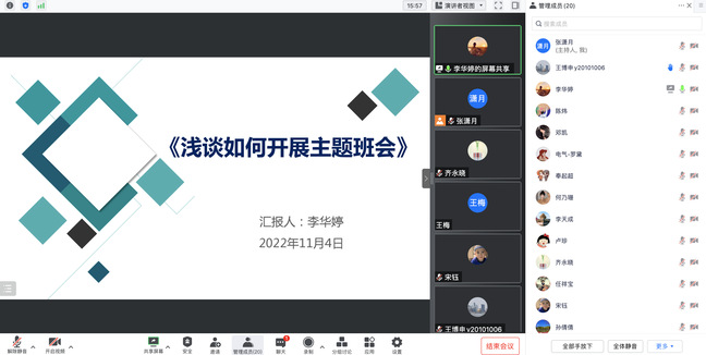 李华婷立足辅导员工作实际,围绕主题班会的背景与意义、主题班会的初心与使命、主题班会的目标与策略、主题班会的未来思考四个方面,结合大学生特点,从选题原则、构建策略、组织形式等讲解如何开展主题班会,结合生动鲜活的工作案例,为与会辅导员开展后续工作提供了宝贵的经验借鉴与启示启发。