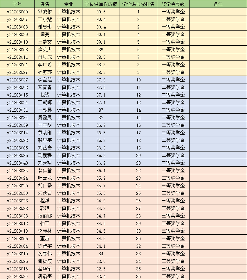 2、计算机技术专业一等分配名额为8,因最后一位与下一位同分,故一等为9人;二等分配名额为12,因一等多1人,应为11人,但最后一位仍与下一位为同分,故二等仍为12人。三等奖分配名额为16,一等二等总人数多1人,故三等为15人。