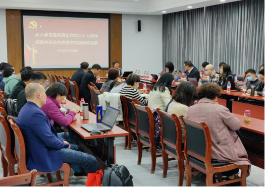 学院党委书记魏建华以《深入学习贯彻落实党的二十大精神凝聚共识奋力推荐学院高质量发展》为题开展书记讲堂,她从党的二十大报告的内容、当前学院面临的形势任务、实施科教兴国战略,强化现代化建设人才支撑以及如何抓好贯彻落实等方面切入,激励广大教师要善于运用党的二十大精神,把握形势、抢抓机遇,立足立德树人根本任务,干事创业、加压奋进,努力在高质量发展赛道上跑马争先。此外,她还对学院2022年整体工作做了汇报,并就2023年工作要点做了通报。