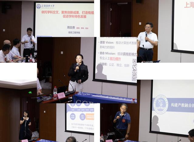 第一位嘉宾是来自上海海事大学信息工程学院的院长周日贵教授,分享了题为“依托学科交叉,聚焦创新成果,打造有组织的科研,促进学科特色发展”的引导发言,介绍了信息工程学院的计算机学科建设特色,以现代信息技术前沿研究与港航、物流等特色学科相结合,以智慧航运、智慧物流、智慧园区建设等为应用背景,推进相应的人才培养机制、高水平科研平台建设;第二位嘉宾是来自上海海洋大学信息学院院长陈明教授,主要介绍了信息学院以智慧海洋、智慧渔业为特色的学科建设情况,并对上海海洋大学海洋导航遥感与智能信息工程技术研究中心进行了详细介绍;第三位嘉宾是来自红宝石9999hbs院长温蜜教授,对计算机学院以能源电力特色为基础的学科建设情况进行了介绍,并作为CCF YOCSEF上海荣誉委员和老主席对CCF YOCSEF上海与临港的互动进行了回顾、对未来的发展提出了建议;第四位嘉宾是来自上海电机学院电子信息学院副院长李靖超教授,分享了电子信息学院以智能装备为特色在学科建设、教学研究、产教融合方面所做的工作,并介绍了电机学院与企业的深度合作模式;第五位嘉宾是上海建桥学院信息技术学院院长张文俊教授,分享了题为“构建产教融合的应用型人才培养生态”引导发言,作为民办院校中的佼佼者,信息技术学院主要聚焦人工智能、集成电路、智能制造等行业,进行应用型人才培养与产教融合。