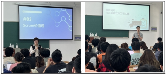 在课程实践启动之前,外企技术专家张伟和杨立斌于6月8日给计算机专业三年级学生作《敏捷实践之Scrum的故事》、《敏捷驱动:打造高效软件工程实践》技术讲座,以讲故事的方式讲解为什么要使用敏捷开发以及如何落地敏捷开发,让学生们感受在企业中软件是如何一步步构建起来。6月9日,企业提供相关技术资源提前发布给学生供自主学习,同时完成课程实践开发基础环境的搭建和配置。