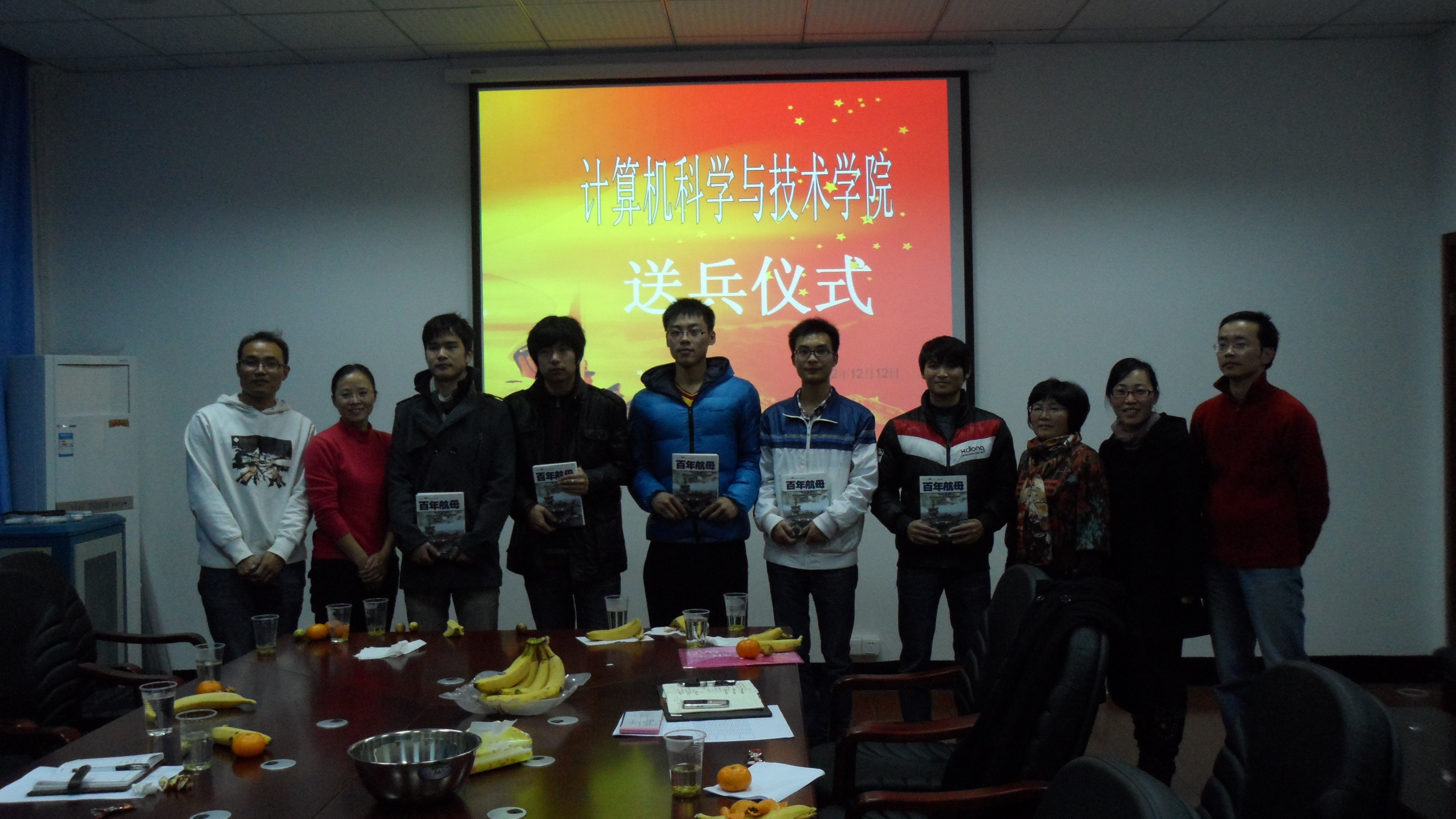 12月13日,学院会议室气氛隆重而热烈。我院2012年送兵仪式在此举行,学院党总支书记张仙智老师、副院长毕忠勤老师和党总支副书记王佳丽老师、辅导员陈雯老师以及新兵班级同学好友出席会议。学院负责征兵事务的辅导员赵铮老师主持会议。