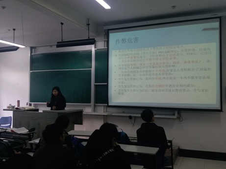 2017年12月19日,计算机学院诚信考试动员大会由各辅导员分别召开。全体辅导员根据《学生手册》对于诚信考试的要求,从公民道德和学校制度两个方面进行了讲解,对于考试违纪处分的新规定进行了着重提醒,对全体本科生做了期末考风考纪动员。良好的学风、考风是学院教学工作、人才培养、学风建设的重要环节,希望大家诚信考试,坚守底线,认真备考,用实际行动实现自己的梦想。此外,辅导员发放了《诚信考试承诺书》,同学们在认真阅读后慎重签下了自己的名字。