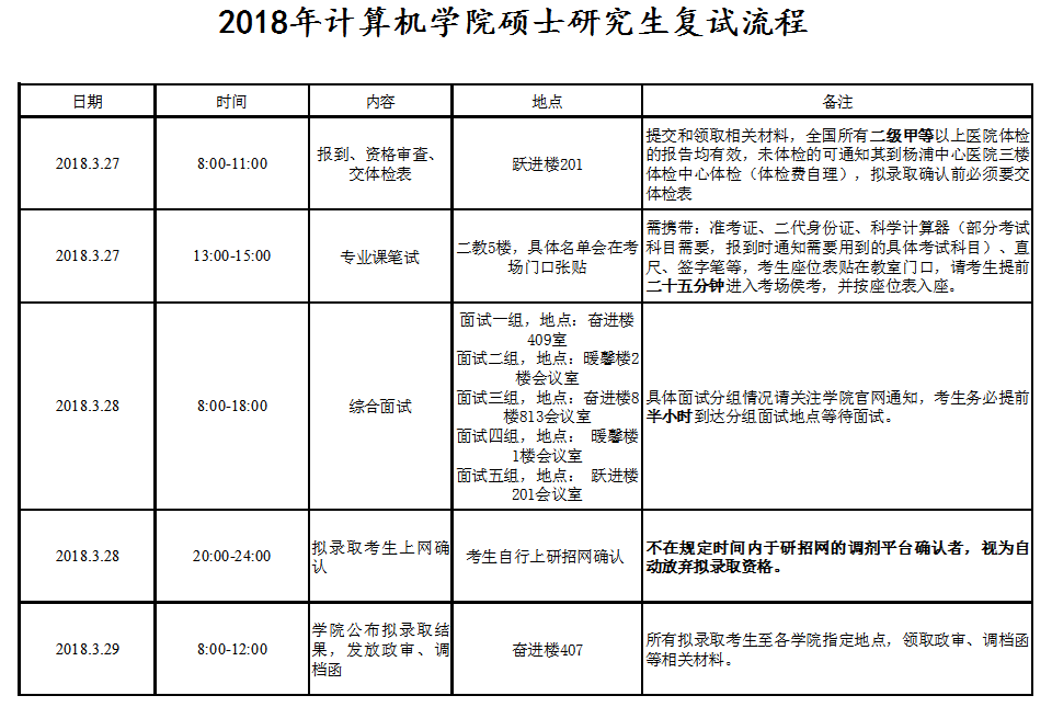 我院复试已定在2018年3月27-28日进行,具体流程拟安排如下: