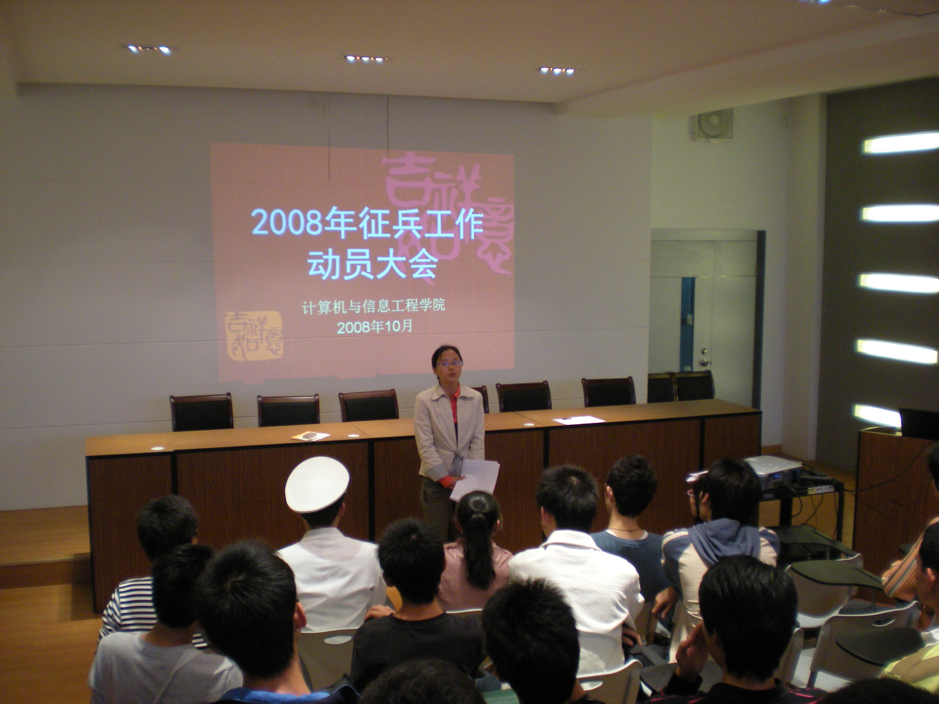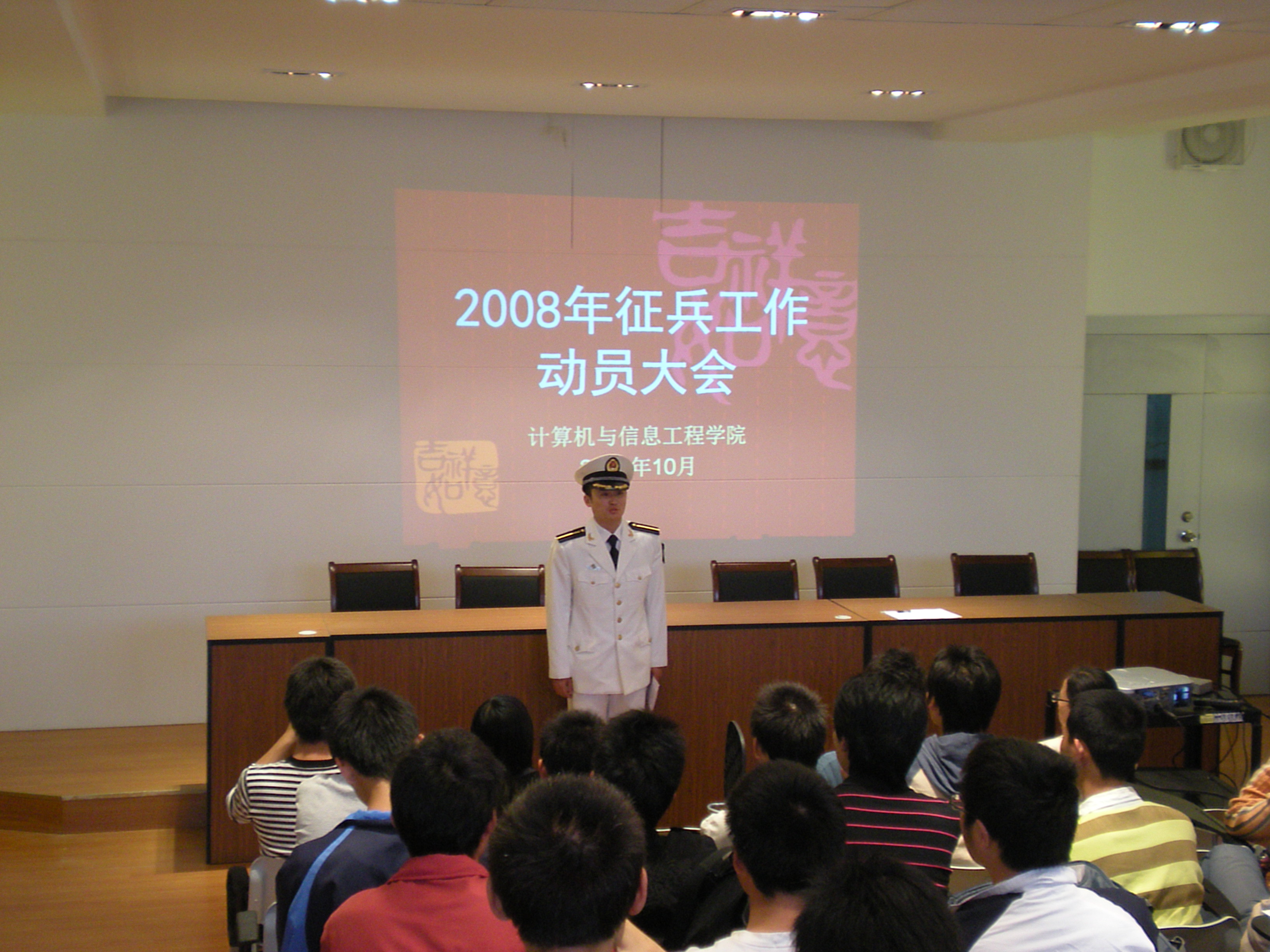 我院2008年冬季征兵工作会议于28日下午在南汇校区第二综合楼308举行。院党总支副书记王佳丽、校武装部金炜等老师和去年入伍的袁公同学出席大会。