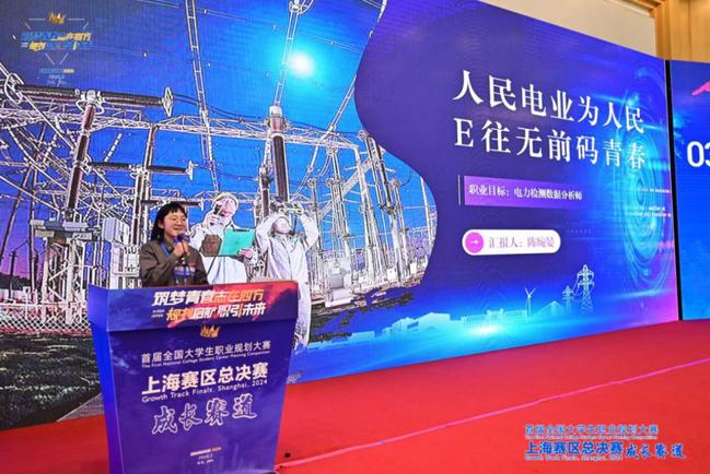 成长赛道分为“主题陈述”、“评委提问”和“喜从天降”三个环节,考察选手职业目标的选择、行动成果的成效以及对目标的契合度等成长要素。陈婉晏以“人民电业为人民,E往无前码青春”为主题,立足于我校能源电力优势,结合数据科学专业特色,讲述了她立志深入家乡贵州遵义最基层,用心、用情、用力成为一名电力检测数据分析师的信念。她从自身家庭成长经历为切口,结合当前国家能源发展需求,详细阐述了她为职业目标作出的技能分析与能力提升,并进一步规划了未来的发展路径,以扎实的专业能力、亲和的态度、谦逊真挚的表达打动评委,凭借优异的综合成绩,斩获成长赛道金奖。