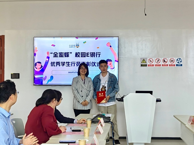 优秀学生行员代表、2023年E银行学生行长王楠芳发言并介绍E银行相关情况及本年度分工。王楠芳讲到,“金蜜蜂”的成长和建设离不开全体成员的辛勤付出与不懈努力,在办公室、后勤保障、新媒体宣传三大部门工作的配合下,“金蜜蜂”为上门咨询的师生答疑,积极协助建行完成银行卡、社保卡的办理与激活,希望各位学生行员能够热心对待进门咨询的师生,认真负责好E银行日常值班与运营管理工作。