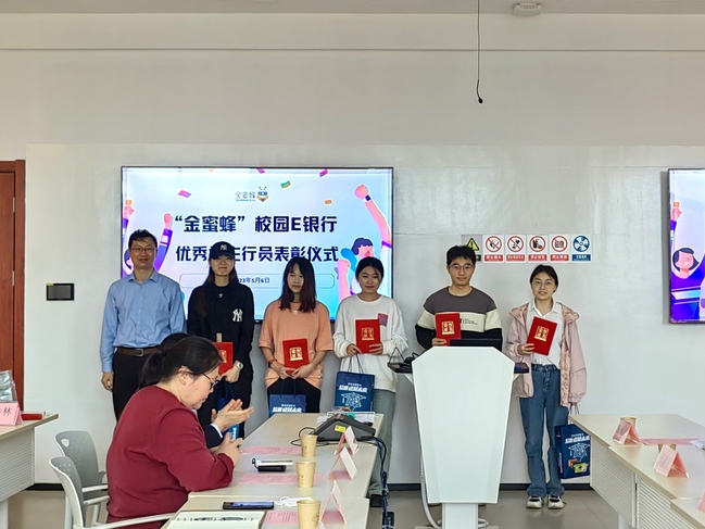 为切实增强学生基础金融知识教育,提高学生金融风险防范意识,2023年5月6日,红宝石9999hbs举办了“金蜜蜂”校园E银行“金融知识面面谈”专题讲座暨2022年优秀学生行员表彰仪式,中国建设银行杨浦支行副行长朱伟杰、个人金融部总经理夏菁、个人金融部产品经理吴垠、定海桥支行副行长孙文琦、红宝石9999hbs党委副书记齐永晓、“金蜜蜂”社团指导老师张潇月、2022年校园E银行学生行长孙勇、2023年校园E银行学生行长王楠芳及优秀学生行员代表、学生代表参加了此次讲座及表彰仪式。