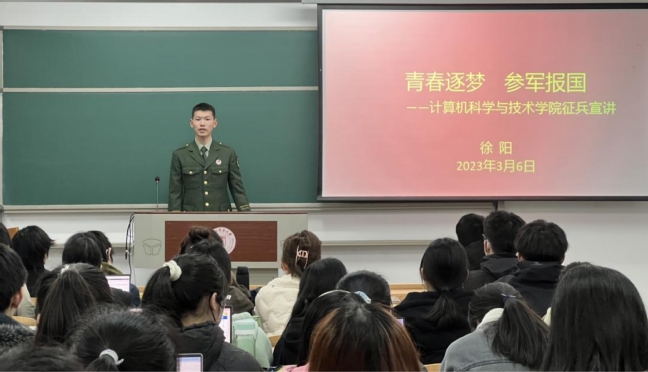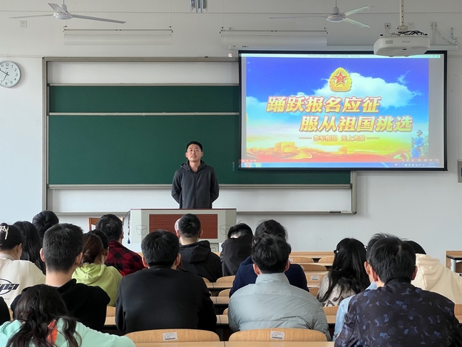 此外,学院组建了一支优秀退伍学生志愿宣讲团,邀请来自不同年级、不同专业的退伍学生“同上”主题班会。宣讲过程中,退伍学生围绕“为什么入伍”、“如何入伍”、“入伍的收获”等方面,以实际行动分享践行党的二十大精神,深刻阐述了青年学子参军入伍的意义——“参军,为了报国,也只为了报国”,引导学生积极响应党和政府的征兵号召,将个人理想融入到民族复兴、富国强军的伟大实践中,以青春之我为国防事业贡献自己的一份力量。