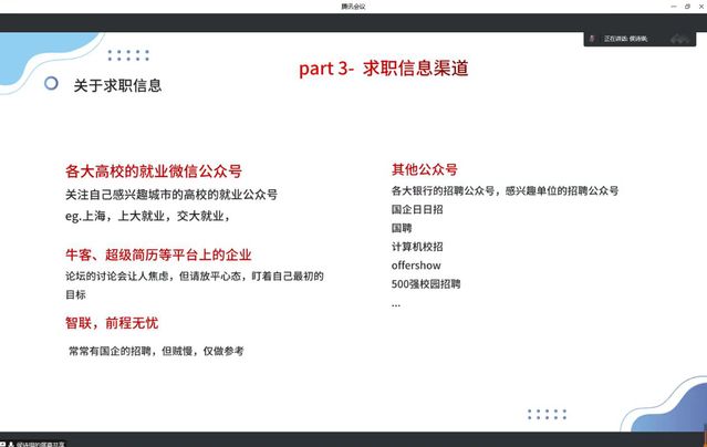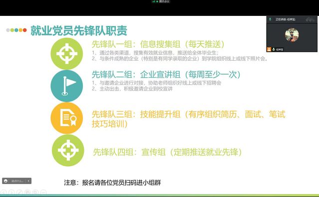 任祥宝老师对计算机学院党员先锋队的职责做了详细介绍。就业党员先锋队分为就业信息搜集、企业进校宣讲、职业技能提升和宣传四个小组,包括帮助就业困难学生提升就业能力,搜集招聘信息,组织企业宣讲和宣传等职责。侯诗琪同学作为上一届就业党员先锋队负责人,从就业方向的划分、地域上的选择、单位的选择以及就业信息渠道的获取等方面分享了其求职和工作经验,让大家收益匪浅。