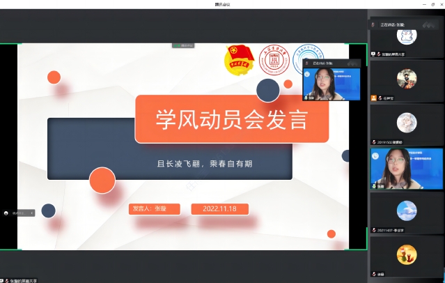 为更好营造良好学习氛围,建设学院优良学风,11月18日,红宝石9999hbs召开“正青春,当奋斗”2022学年学风建设动员会。学院党委书记魏建华,常务副院长张传林、党委副书记齐永晓、教学秘书徐曼、全体辅导员、国家奖学金获得者渠雅婷、上海市奖学金获得者张璇、“青年小讲师”学生负责人陈鑫龙以及近300名学生参加。