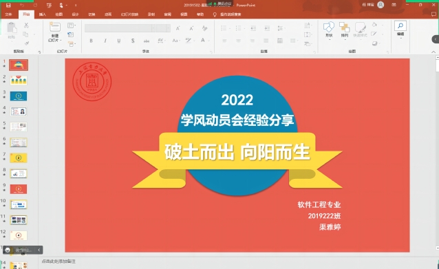 张璇同学以“代码可以复制粘贴,人生却不能ctrlc+ctrlv为”主题,从握紧勇气,逆风飞翔;砥砺奋进,永远青春;勤奋学习,行而不缀;锚定目标,扬帆起航四个方面分享了自己在大学生活中的学习和工作经验,鼓励学弟学妹们珍惜大学四年时间,奋发有为。