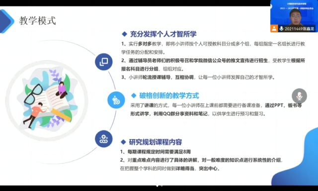 陈鑫龙同学围绕“帮困助学,教学相长”进行了主题发言,就计算机学院“青年小讲师”项目从活动组织、教学模式、取得成果以及小讲师体会等方面对活动进行详细介绍,并从参与人数、授课模式、课程安排等方面介绍了本期活动详情,并欢迎更多优秀同学加入青年小讲师,共同帮困助学。