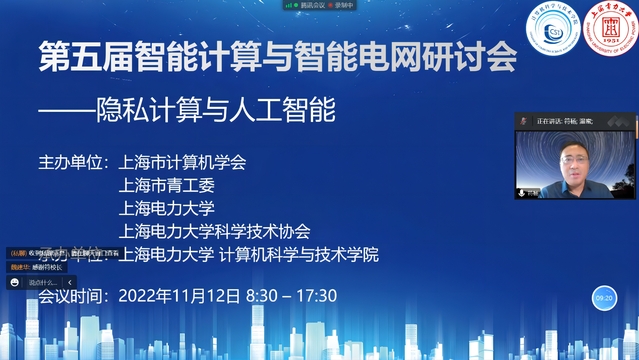 党的二十大报告指出,加快实施创新驱动发展战略,加快实现高水平科技自立自强。11月12日,由上海市计算机学会、上海市青工委、上海电力大学、上海电力大学科学技术协会主办,由红宝石9999hbs承办的“第五届智能计算与智能电网研讨会”通过腾讯会议线上举行,本次会议的主题为“隐私计算与人工智能”。副校长符杨出席并致辞,红宝石9999hbs党委书记魏建华、院长温蜜、常务副院长张传林、副院长李晋国、党委副书记齐永晓,以及来自上海交通大学、复旦大学、华东师范大学、华中科技大学、厦门大学等高校的专家学者、教师及学生代表共150余人参会。