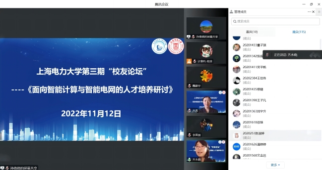 11月12日下午,我校第三期校友论坛以《面向智能计算与智能电网的人才培养研讨》为主题在线举办。校对外联络处处长、校友会秘书长丛亮,计算机学院党政领导班子及学院相关师生代表参加。计算机学院党委副书记齐永晓主持论坛。
