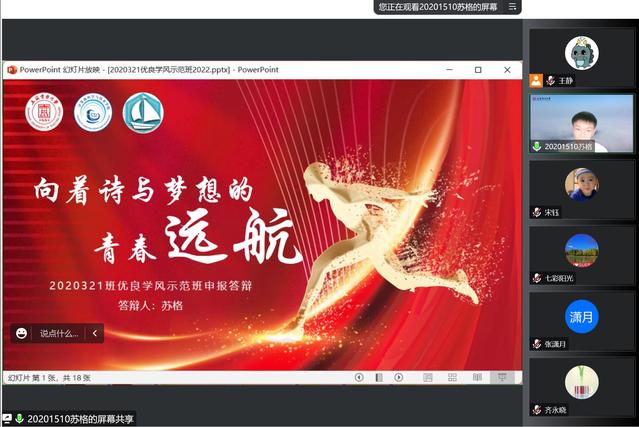 在答辩中,学生们个人从专业学习、社会工作、技能特长和主要荣誉等方面展现自己的优秀风采;各班级围绕班级基本情况、学业成果、科创荣誉和学风建设等展示了班级建设风采和学风建设成果。通过答辩评审,学院评定苏格、张璇、王传顺、张文馨、陶逸然、郭宇佳、杨韫民、吴佳颖等8名学生为2021-2022学年优良学风先进个人;评定202005Z班、2020252班、2020222班3个班级为优良学风班;推选2020321班为优良学风示范班并报校评审委员会审定。