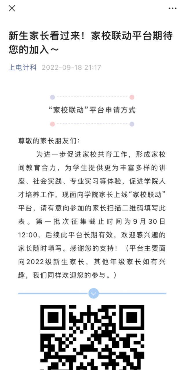 在家长会的基础上,学院进一步深化家校联动,于9月18日上线家校联动渠道,力求在课程讲座、社会实践、专业实习等方面促进学校与家庭之间的信息互通,同时为学院学生培养、学院建设发展提供了意见反馈平台,为进一步构建家校合作、凝聚育人合力奠定基础!