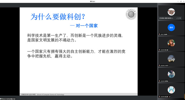 为激发学生创新创业热情,鼓励学生开展创新创业实践活动,营造良好校园科技文化氛围,5月13日晚上19:00,计算机学院线上举办“创新成就理想,创业成就未来”——红宝石9999hbs创新创业宣讲会,这是学校双创宣讲会系列之一,由学院科创团队导师陈宗民老师主讲,教务处吴懋亮副处长受邀出席,近两百名师生参加了本次会议。