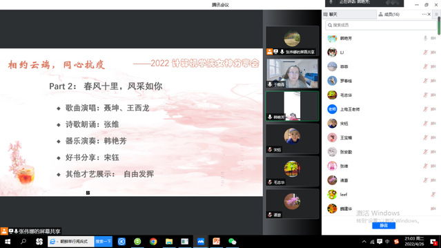 活动由计算机学院工会主席于晓青主持,学院党委书记魏建华、院长温蜜、副书记齐永晓也积极参与到了活动中与女教师们交流分享。她们亦是十分关心女教师们的居家隔离生活和工作状态,关注女教师的身心健康!活动分为两个部分:一是防疫抗疫的经验分享;二是学院女教师的各类才艺展示。