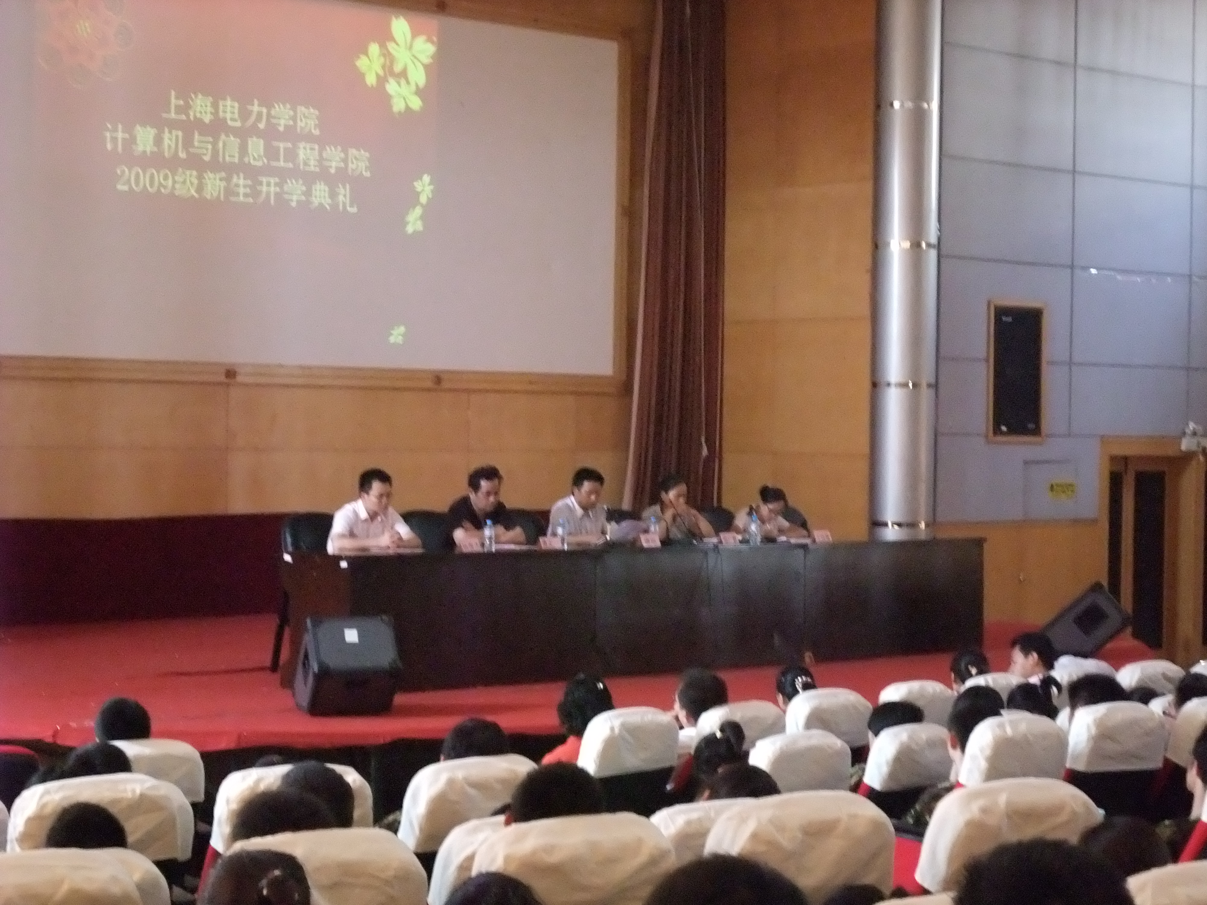 9月7日下午,计信学院在尚智堂举行了2009级新生开学典礼。学院常务副院长唐忠,党总支书记徐广新,教务副院长施正一,党总支副书记王佳丽,院长助理杨俊杰等学院领导以及各专业系主任、党支部书记及辅导员出席了大会。大会由党总支书记徐广新主持。