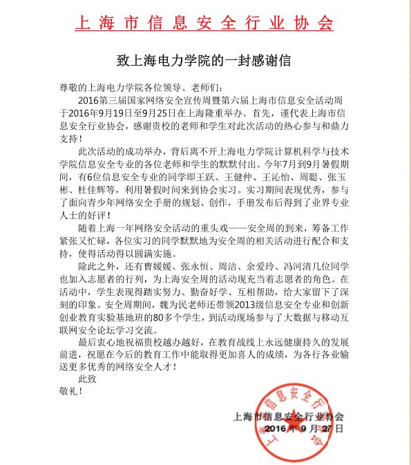 9月19日至9月25日,上海隆重举办了2016第三届国家网络安全宣传周暨第六届上海市信息安全活动周。我院师生积极参加协会实习、志愿服务和交流学习,受到上海市信息安全行业协会发来的表扬信。