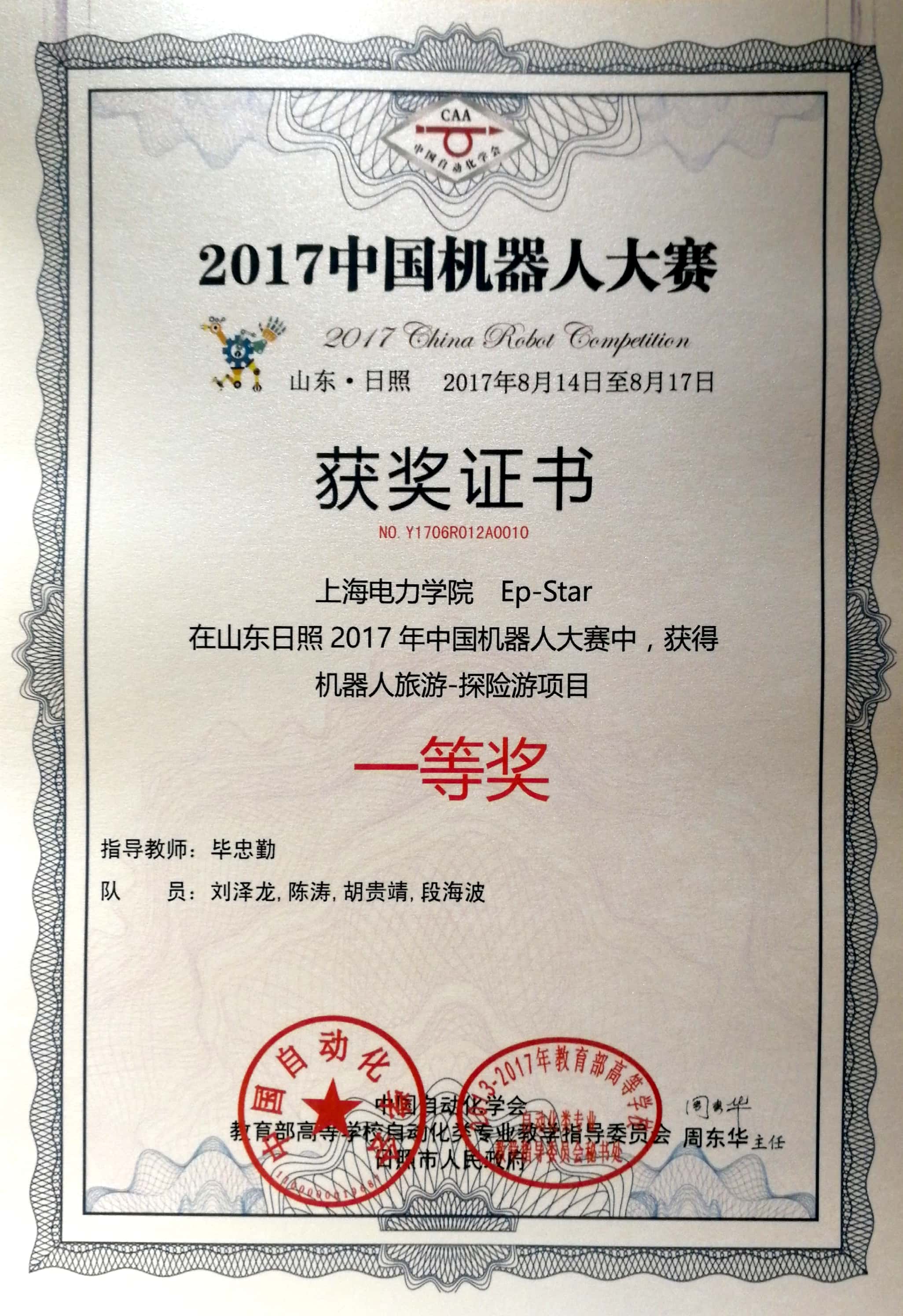8月14日至18日,由中国自动化学会、山东省日照市人民政府主办的“创泽信息杯”2017中国机器人大赛在山东体育学院举行,由我院机器人实验室成员刘泽龙、胡贵靖、陈涛、段海波、王知涵组成的EP-star代表队在毕忠勤老师的指导下,积极备赛,在激烈的角逐中闯关过将,最终夺得机器人旅游-探险游项目全国一等奖。