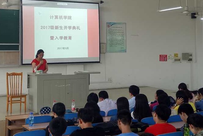 我院2017级新生开学典礼暨入学教育于9月4日在北2101教室隆重召开。院长温蜜老师,副院长毕忠勤老师,党委副书记余南飞老师,办公室主任诸葛琼老师,软件工程系主任周平老师,实验室中心主任徐媛老师,信息安全学生党支部书记吴涵老师,分团委负责人曹晓声老师出席了本次大会。大会由新生辅导员朱佳老师主持。